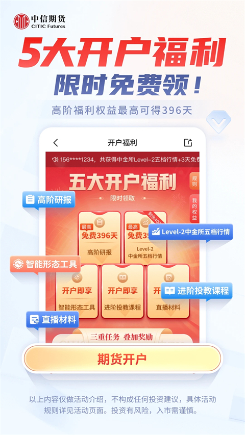 中信期货APP是中信期货自主研发的一款金融服务软件,集合一键开户、闪电行情、场景化交易等多项功能于一体。平台汇聚大量期货资讯,便于用户发现有潜力的品种,从而争取更好的期货投资回报。中信期货APP还汇集海量公募与私募基金以及资管产品,通过多种优选组合助力理财增值。用户可在线快速开户,掌握市场热点、板块资金流向并追踪内外盘行情。面向高净值客户,提供定制化金融组合和专属财富管理方案。平台支持实盘与仿真交易,并具备条件单功能,致力于打造便捷的线上期货投资体验。有需要的用户可在本站免费下载使用。