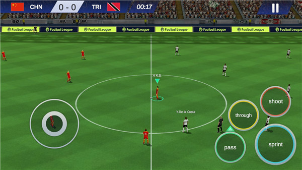 2、操作用的是虚拟摇杆加固定按键。左下角摇杆控制跑位,右下角三个按钮是传球、射门和切换控制球员,防守时会自动变成抢球、铲球等动作,手感挺顺的。