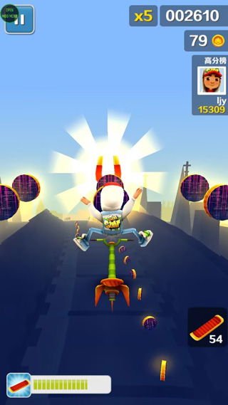 捡到喷气背包后,角色会在空中的缆线上飞行,路上不会撞到障碍,而且会刷出一大堆金币,收着很爽。