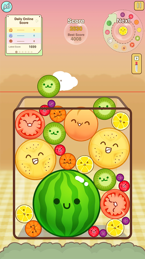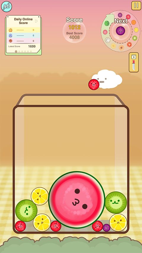 2、画面上会不断出现各种水果,玩家需要选择一条纵坐标把当前水果抛下