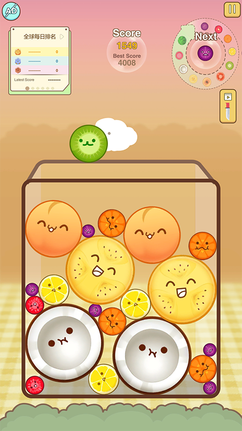 4、水果种类多且大小不一,已掉落的水果会继续自由滚动,玩家无法直接操控这些滚动的果实,因此建议保持合理的摆放,不要盲目追求复杂结构
