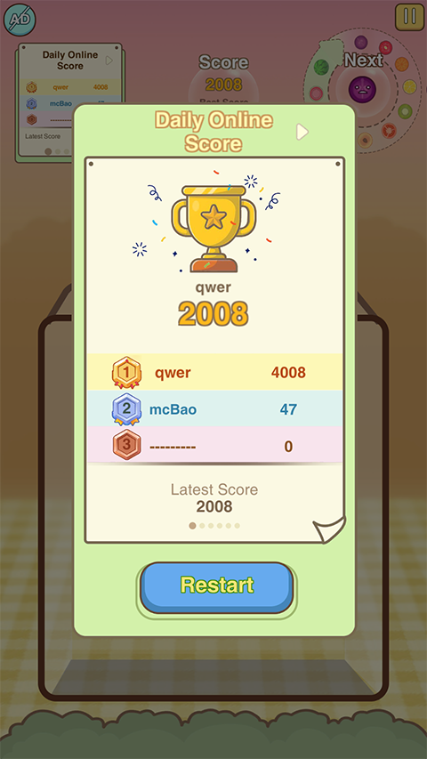 5、相同的水果接触后会合并成更大一级的果实,最终目标就是合成出“大西瓜”(这也是本作名字的由来)